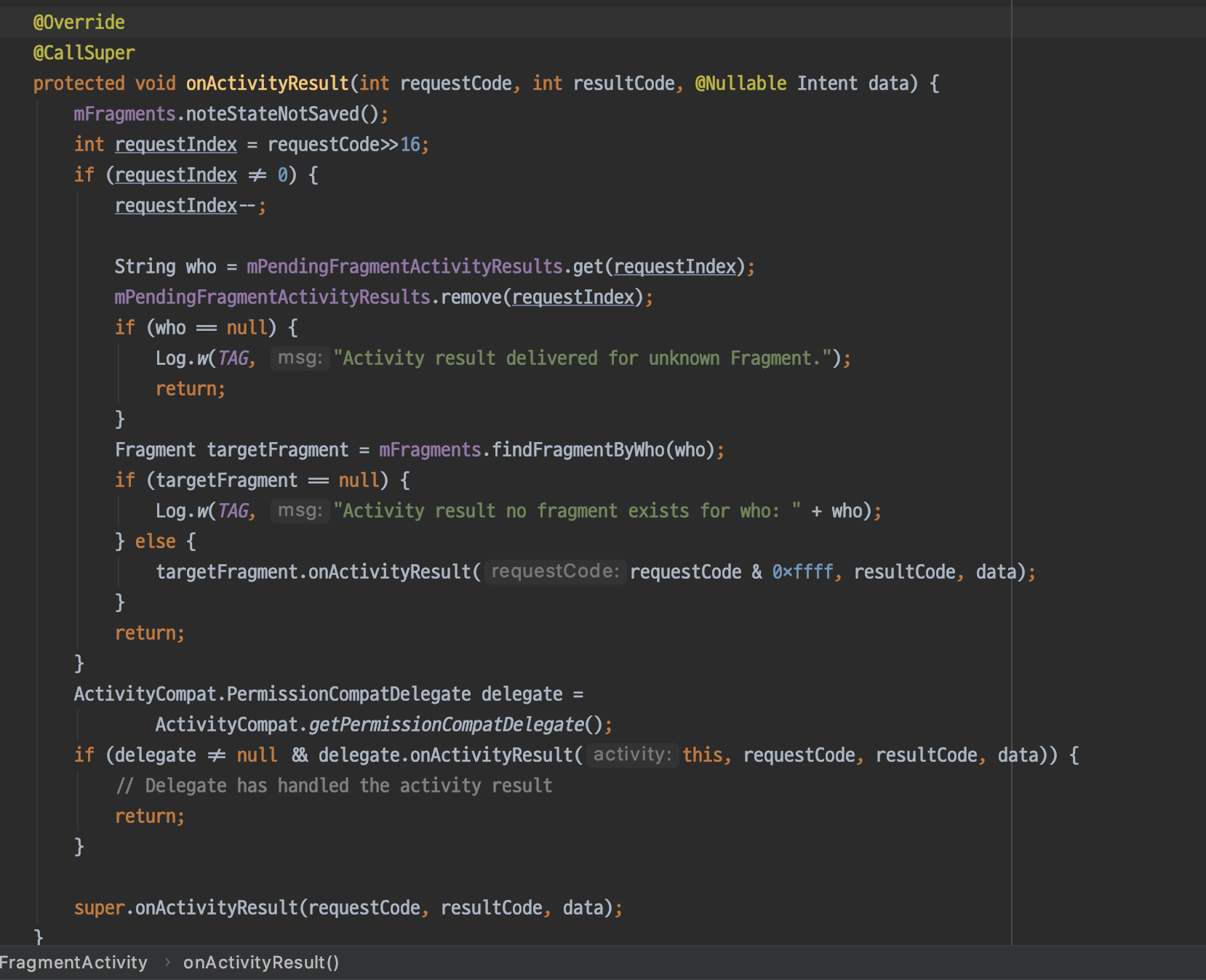 그래서, >> 16 연산을 했을 때 0이 아니면 Fragment 에서 startActivityForResult 를 한 것으로 판단하고, Fragment 에 DATA 를 전달하기 위해서 findFragmentByWho 로 Fragment 검색 후 그 Fragment 의 onActivityResult를 호출합니다.