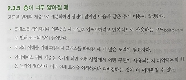 3. 좋은 코드를 만들기 위해 특정패턴을 사용하거나 추상화 계층으로 쪼개는 방법 등, 이러한 방법들이 과해질 경우 생기는 문제 등도 같이 언급 되어 있는데, 이런 점은 공식처럼 대입해서 적용하는 게 아니라 내 코드를 떠 올리며 최선의 방법을 고민하게 해주는 소스 역할을 해주는 것 같아 이런 점이 개인적으로 좋았습니다.