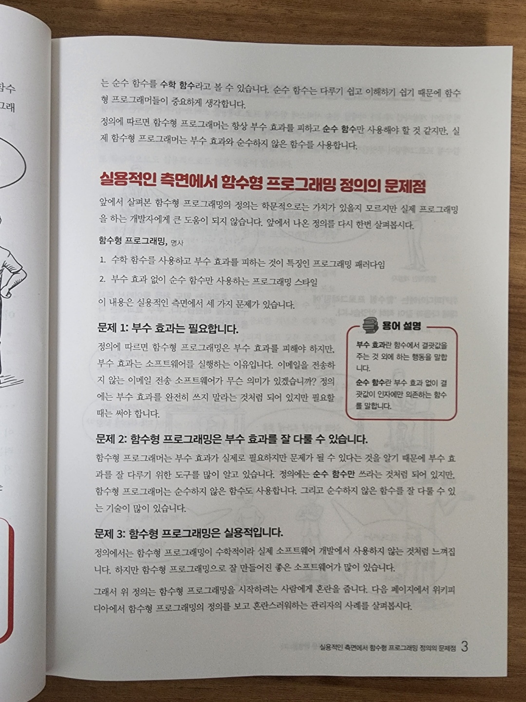 개인적으로는 이야기형식, 자바스크립트라는 예제코드 등과 같이 실무와 가깝게 풀어내려는 이러한 마인드가 책의 가장 큰 장점이라고 보는데, 그 이유는 실무에서 적용되는 함수형 프로그래밍의 한계도 인정하고, 그렇다면 어떻게 적용하면되는 지 고민하게 만들고 해결책을 제시다. 그래서, 함수형 프로그래밍 장점을 가지고 이렇게 하면 OOP에도 적용할 수 있겠다라는 생각도 들고, 프로그래밍적인 통찰을 많이 배울 수 있기 때문이다.