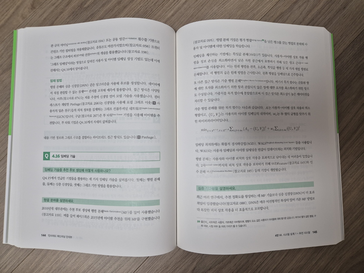 책에 등장하는 질문들을 보면 로지스틱 회귀분석의 원리부터 콜드 스타트 문제 해결 방안, 대규모 추천 시스템 아키텍처 설계까지 머신러닝 실무자라면 반드시 알아야 할 개념들로 구성되어 있습니다. 저는 특히 자연어 이해와 추천 시스템을 구축할 때 고려해야 할 사항들을 이 책을 통해 도움을 받았습니다. 자연어 이해 파트에서는 문서 요약, 감성 분석, 토픽 모델링 등 다양한 태스크에 활용되는 피처 엔지니어링 기법과 모델링 노하우를 배울 수 있었습니다. 또한 추천 시스템 챕터에서는 사용자 행동 로그를 기반으로 한 암묵적 피드백의 활용 등 실무에 적용 가능한 인사이트를 얻을 수 있었습니다.