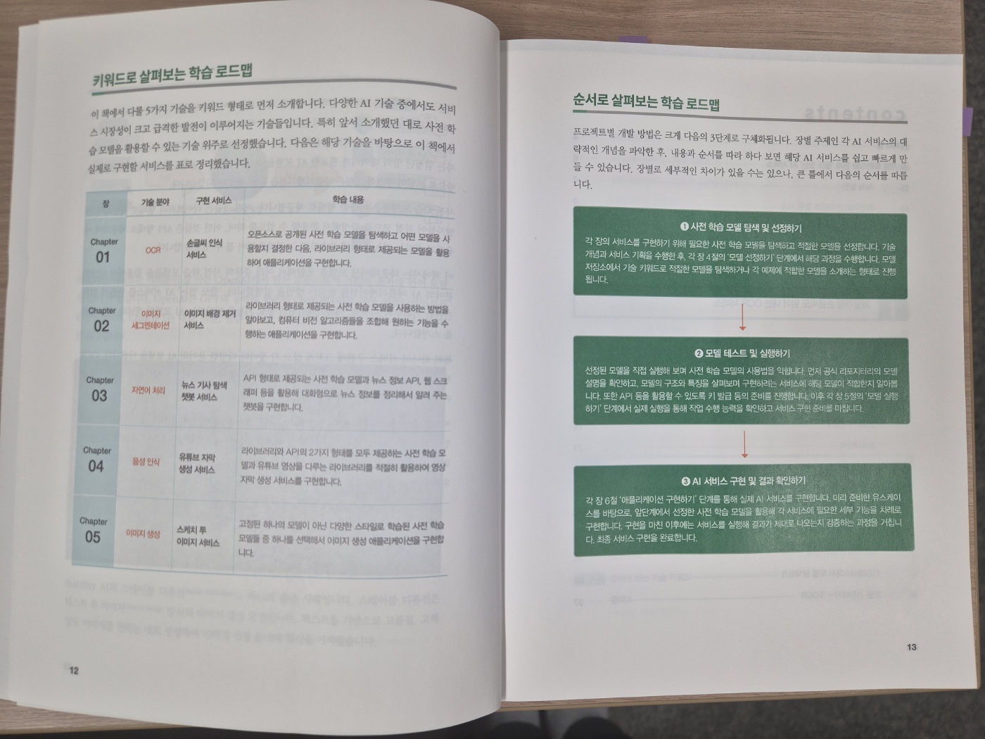 각 장마다 특정 AI 기술(OCR, 이미지 세그멘테이션, 자연어 처리, 음성 인식, 이미지 생성)을 다루며, 개념 설명부터 시작해 서비스 기획, 모델 선정, 실제 구현까지 단계별로 상세히 설명합니다.